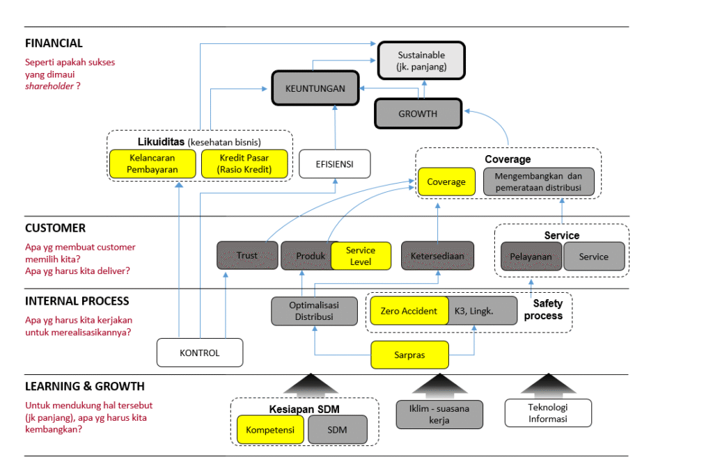 Proses menterjemahkan visi-misi dan strategi organisasi ke dalam sasaran-sasaran stratejik yang saling terkait satu dengan lainnya. Peta strategi ini bersifat menyeluruh, yang mencakup perspektif keuangan, pelanggan, proses internal, dan learning & growth.
